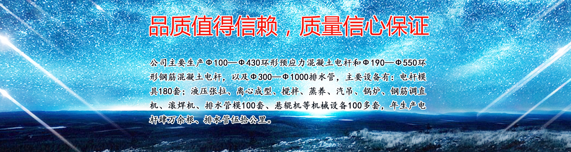 公司主要生產ф100—ф430環形預應力混凝土電桿和ф190—ф550環形鋼筋混凝土電桿,以及ф300—ф1000排水管,主要設備有:電桿模具180套;液壓張拉、離心成型、攪拌、蒸養、汽吊、鍋爐、鋼筋調直機、滾焊機、排水管模100套、懸輥機等機械設備100多套,年生產電桿肆萬余根、排水管伍拾公里。……